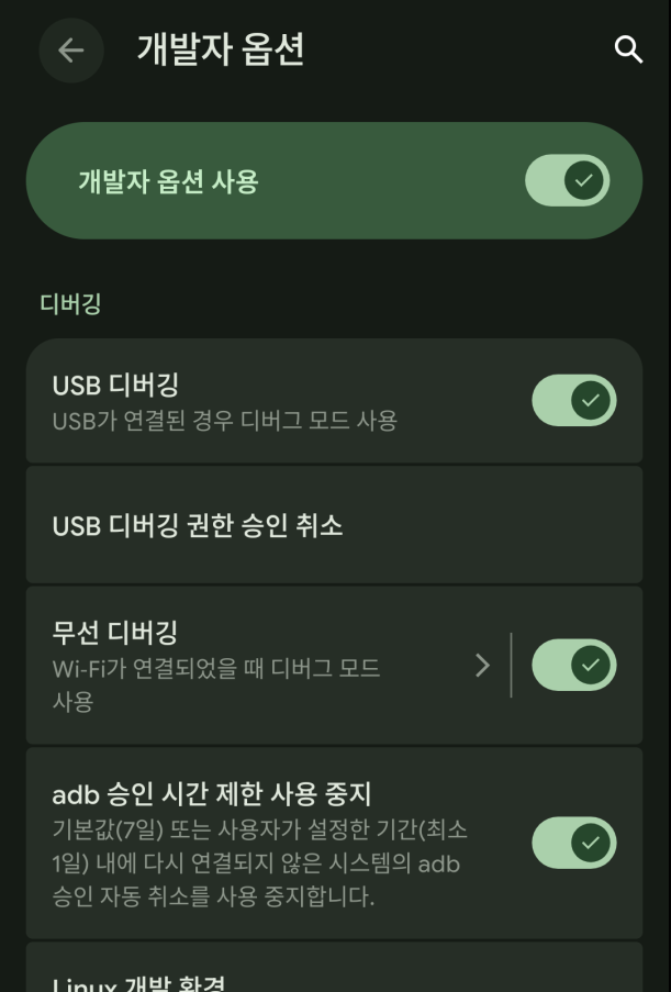 이번에는 휴대폰의 설정 > 시스템 > 개발자 옵션 > 무선 디버깅에 들어가주세요
