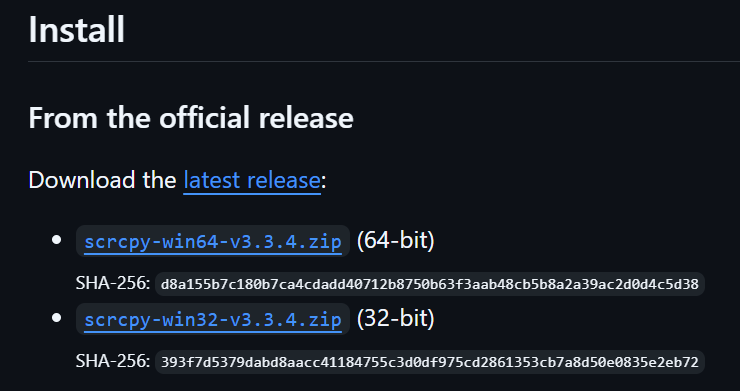 scrcpy는 아래의 링크 1개만을 공식 사이트로 취급하고 있으니 다른 사이트 말고 반드시 아래 링크에서 다음과 같이 진행해주시면 됩니다.